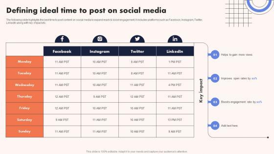 The following slide highlights the best time to post content on social media to expand reach and boost engagement. It includes platforms such as Facebook, Instagram, Twitter, LinkedIn along with key impact, etc. Make sure to capture your audiences attention in your business displays with our gratis customizable Defining Ideal Time To Post On Social Media Running Marketing Campaigns Strategy SS V. These are great for business strategies, office conferences, capital raising or task suggestions. If you desire to acquire more customers for your tech business and ensure they stay satisfied, create your own sales presentation with these plain slides. The following slide highlights the best time to post content on social media to expand reach and boost engagement. It includes platforms such as Facebook, Instagram, Twitter, LinkedIn along with key impact, etc.