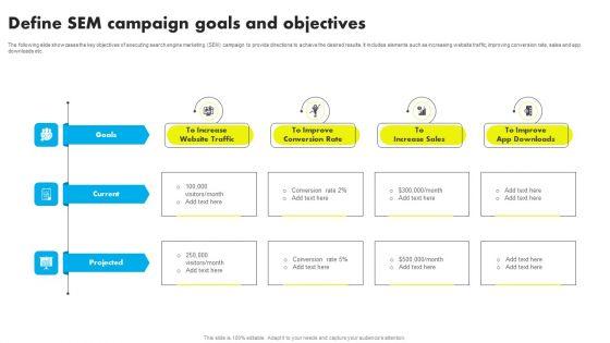 The following slide showcases the key objectives of executing search engine marketing SEM campaign to provide directions to achieve the desired results. It includes elements such as increasing website traffic, improving conversion rate, sales and app downloads etc. Make sure to capture your audiences attention in your business displays with our gratis customizable Define SEM Campaign Goals And Objectives Ppt Portfolio Graphics Tutorials PDF. These are great for business strategies, office conferences, capital raising or task suggestions. If you desire to acquire more customers for your tech business and ensure they stay satisfied, create your own sales presentation with these plain slides.
