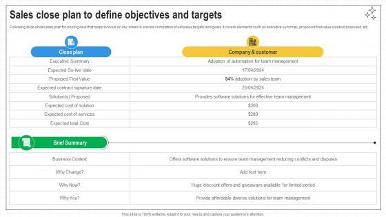 Following slide showcases plan for closing deal that helps to focus on key areas to ensure completion of set sales targets and goals. It covers elements such as executive summary, proposed first value solution proposed, etc. Boost your pitch with our creative Closing Techniques To Seal Sales Close Plan To Define Objectives And Targets SA SS V. Deliver an awe-inspiring pitch that will mesmerize everyone. Using these presentation templates you will surely catch everyones attention. You can browse the ppts collection on our website. We have researchers who are experts at creating the right content for the templates. So you do not have to invest time in any additional work. Just grab the template now and use them. Following slide showcases plan for closing deal that helps to focus on key areas to ensure completion of set sales targets and goals. It covers elements such as executive summary, proposed first value solution proposed, etc.