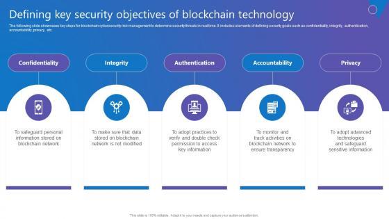 The following slide showcases key steps for blockchain cybersecurity risk management to determine security threats in real time. It includes elements of defining security goals such as confidentiality, integrity, authentication, accountability, privacy, etc. Want to ace your presentation in front of a live audience Our Defining Key Security Objectives Comprehensive Guide To Blockchain Digital Security Rules Pdf can help you do that by engaging all the users towards you. Slidegeeks experts have put their efforts and expertise into creating these impeccable powerpoint presentations so that you can communicate your ideas clearly. Moreover, all the templates are customizable, and easy to edit and downloadable. Use these for both personal and commercial use. The following slide showcases key steps for blockchain cybersecurity risk management to determine security threats in real time. It includes elements of defining security goals such as confidentiality, integrity, authentication, accountability, privacy, etc.