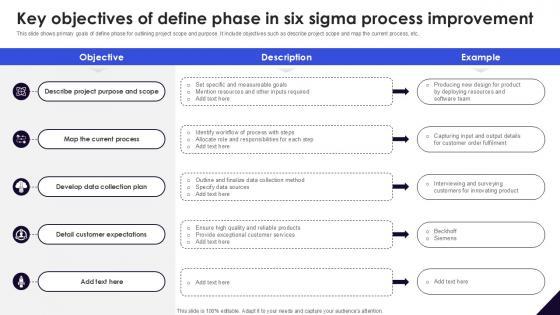 This slide shows primary goals of define phase for outlining project scope and purpose. It include objectives such as describe project scope and map the current process, etc. Crafting an eye-catching presentation has never been more straightforward. Let your presentation shine with this tasteful yet straightforward Key Objectives Of Define Phase In Lean Six Sigma In Manufacturing Ppt Example template. It offers a minimalistic and classy look that is great for making a statement. The colors have been employed intelligently to add a bit of playfulness while still remaining professional. Construct the ideal Key Objectives Of Define Phase In Lean Six Sigma In Manufacturing Ppt Example that effortlessly grabs the attention of your audience Begin now and be certain to wow your customers This slide shows primary goals of define phase for outlining project scope and purpose. It include objectives such as describe project scope and map the current process, etc.