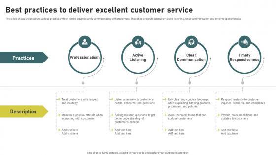 This slide shows details about various practices which can be adopted while communicating with customers. These tips are professionalism, active listening, clear communication and timely responsiveness. Want to ace your presentation in front of a live audience Our Best Practices To Deliver Excellent Investment Banking Simplified Functions Fin SS V can help you do that by engaging all the users towards you. Slidegeeks experts have put their efforts and expertise into creating these impeccable powerpoint presentations so that you can communicate your ideas clearly. Moreover, all the templates are customizable, and easy-to-edit and downloadable. Use these for both personal and commercial use. This slide shows details about various practices which can be adopted while communicating with customers. These tips are professionalism, active listening, clear communication and timely responsiveness.