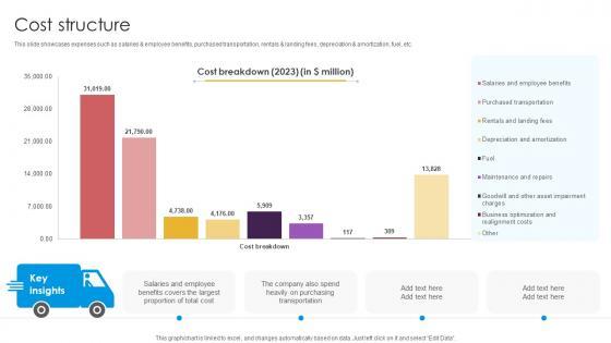 This slide showcases expenses such as salaries and employee benefits, purchased transportation, rentals and landing fees, depreciation and amortization, fuel, etc. Create an editable Cost Structure Delivery Service Provider Business Model BMC SS V that communicates your idea and engages your audience. Whether you are presenting a business or an educational presentation, pre-designed presentation templates help save time. Cost Structure Delivery Service Provider Business Model BMC SS V is highly customizable and very easy to edit, covering many different styles from creative to business presentations. Slidegeeks has creative team members who have crafted amazing templates. So, go and get them without any delay. This slide showcases expenses such as salaries and employee benefits, purchased transportation, rentals and landing fees, depreciation and amortization, fuel, etc.