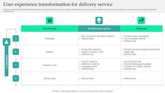 The below slide deals with problems involved in delivery of product or service and provide solutions which help business to build a good reputation and improve customer loyalty. Key issues listed are packaging, delivery and customer care. Showcasing this set of slides titled User Experience Transformation For Delivery Service Guidelines Pdf. The topics addressed in these templates are Service Type, Problem Description, Solutions. All the content presented in this PPT design is completely editable. Download it and make adjustments in color, background, font etc. as per your unique business setting. The below slide deals with problems involved in delivery of product or service and provide solutions which help business to build a good reputation and improve customer loyalty. Key issues listed are packaging, delivery and customer care.
