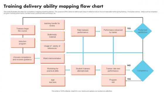 This slide Illustrates the steps for competency mapping in training delivery .The purpose of this slides to define each steps in detail to reduce miscommunication while giving training. It includes various steps such as induction program, trainee performance, bundle review, practical skills workshops, etc. Showcasing this set of slides titled Training Delivery Ability Mapping Flow Chart Diagrams Pdf The topics addressed in these templates are Multimedia Material, Receives Guidance, Performed Satisfactory All the content presented in this PPT design is completely editable. Download it and make adjustments in color, background, font etc. as per your unique business setting. This slide Illustrates the steps for competency mapping in training delivery .The purpose of this slides to define each steps in detail to reduce miscommunication while giving training. It includes various steps such as induction program, trainee performance, bundle review, practical skills workshops, etc.