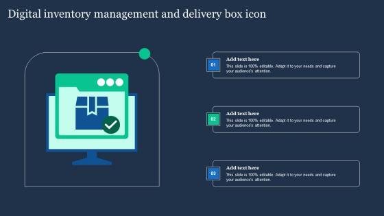 Pitch your topic with ease and precision using this Digital Inventory Management And Delivery Box Icon Template Pdf. This layout presents information on Digital Inventory Management, Delivery Box Icon. It is also available for immediate download and adjustment. So, changes can be made in the color, design, graphics or any other component to create a unique layout. Our Digital Inventory Management And Delivery Box Icon Template Pdf are topically designed to provide an attractive backdrop to any subject. Use them to look like a presentation pro.