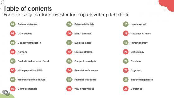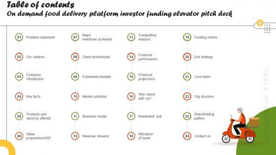 Boost your pitch with our creative Table Of Contents On Demand Food Delivery Platform Investor Funding Elevator Pitch Deck. Deliver an awe-inspiring pitch that will mesmerize everyone. Using these presentation templates you will surely catch everyones attention. You can browse the ppts collection on our website. We have researchers who are experts at creating the right content for the templates. So you do not have to invest time in any additional work. Just grab the template now and use them. Our Table Of Contents On Demand Food Delivery Platform Investor Funding Elevator Pitch Deck are topically designed to provide an attractive backdrop to any subject. Use them to look like a presentation pro.