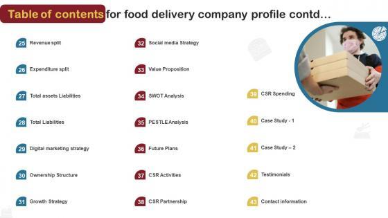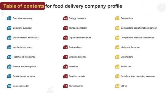 Want to ace your presentation in front of a live audience Our Table Of Contents For Food Delivery Company Profile CP SS V can help you do that by engaging all the users towards you. Slidegeeks experts have put their efforts and expertise into creating these impeccable powerpoint presentations so that you can communicate your ideas clearly. Moreover, all the templates are customizable, and easy-to-edit and downloadable. Use these for both personal and commercial use. Our Table Of Contents For Food Delivery Company Profile CP SS V are topically designed to provide an attractive backdrop to any subject. Use them to look like a presentation pro.