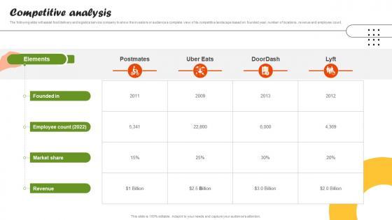 The following slide will assist food delivery and logistics service company to show the investors or audience a complete view of its competitive landscape based on founded year, number of locations, revenue and employee count. Want to ace your presentation in front of a live audience Our Competitive Analysis On Demand Food Delivery Platform Investor Funding Elevator Pitch Deck can help you do that by engaging all the users towards you. Slidegeeks experts have put their efforts and expertise into creating these impeccable powerpoint presentations so that you can communicate your ideas clearly. Moreover, all the templates are customizable, and easy-to-edit and downloadable. Use these for both personal and commercial use. The following slide will assist food delivery and logistics service company to show the investors or audience a complete view of its competitive landscape based on founded year, number of locations, revenue and employee count.