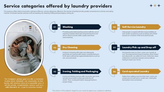 Do you know about Slidesgeeks Service Categories Offered By Laundry Providers On Demand Laundry Business Plan Infographics Pdf These are perfect for delivering any kind od presentation. Using it, create PowerPoint presentations that communicate your ideas and engage audiences. Save time and effort by using our pre designed presentation templates that are perfect for a wide range of topic. Our vast selection of designs covers a range of styles, from creative to business, and are all highly customizable and easy to edit. Download as a PowerPoint template or use them as Google Slides themes. The purpose of this slide is to provide a glimpse of the key service categories offered by the laundry shop that provide greater convenience in a timely and caring manner. It includes laundry services such as washing, dry cleaning, folding and packaging, ironing, etc.