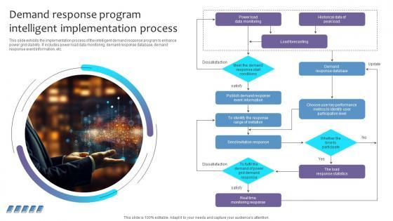This slide exhibits the implementation process of the intelligent demand response program to enhance power grid stability. It includes power load data monitoring, demand response database, demand response event information, etc. Find highly impressive Empowering The Future Demand Response Program Intelligent Implementation Process IoT SS V on Slidegeeks to deliver a meaningful presentation. You can save an ample amount of time using these presentation templates. No need to worry to prepare everything from scratch because Slidegeeks experts have already done a huge research and work for you. You need to download Empowering The Future Demand Response Program Intelligent Implementation Process IoT SS V for your upcoming presentation. All the presentation templates are 100 percent editable and you can change the color and personalize the content accordingly. Download now This slide exhibits the implementation process of the intelligent demand response program to enhance power grid stability. It includes power load data monitoring, demand response database, demand response event information, etc.