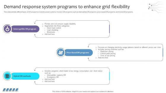 This slide exhibits different types of DR programs in electric power systems. It covers DR programs such as interruptible DR programs, price-based DR programs, and hybrid DR programs. If your project calls for a presentation, then Slidegeeks is your go-to partner because we have professionally designed, easy-to-edit templates that are perfect for any presentation. After downloading, you can easily edit Empowering The Future Demand Response System Programs To Enhance Grid Flexibility IoT SS V and make the changes accordingly. You can rearrange slides or fill them with different images. Check out all the handy templates This slide exhibits different types of DR programs in electric power systems. It covers DR programs such as interruptible DR programs, price-based DR programs, and hybrid DR programs.