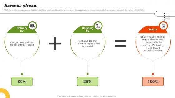 The following slide showcases revenue streams of a food delivery and logistics service company which provide access to customer for nearby food outlets. It generates revenue through delivery fees and shipping fee. Do you have to make sure that everyone on your team knows about any specific topic I yes, then you should give Revenue Stream On Demand Food Delivery Platform Investor Funding Elevator Pitch Deck a try. Our experts have put a lot of knowledge and effort into creating this impeccable Revenue Stream On Demand Food Delivery Platform Investor Funding Elevator Pitch Deck. You can use this template for your upcoming presentations, as the slides are perfect to represent even the tiniest detail. You can download these templates from the Slidegeeks website and these are easy to edit. So grab these today The following slide showcases revenue streams of a food delivery and logistics service company which provide access to customer for nearby food outlets. It generates revenue through delivery fees and shipping fee.