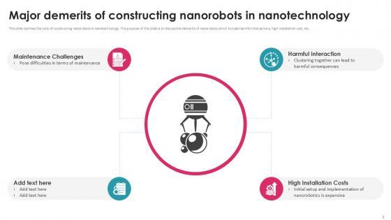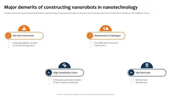 This slide outlines the cons of constructing nanorobots in nanotechnology. The purpose of this slide is to discuss the demerits of nanorobots which include harmful interactions, high installation cost, etc. Find a pre-designed and impeccable Major Demerits Of Constructing Exploring Nanorobotics In Space PPT Example. The templates can ace your presentation without additional effort. You can download these easy-to-edit presentation templates to make your presentation stand out from others. So, what are you waiting for Download the template from Slidegeeks today and give a unique touch to your presentation. This slide outlines the cons of constructing nanorobots in nanotechnology. The purpose of this slide is to discuss the demerits of nanorobots which include harmful interactions, high installation cost, etc.