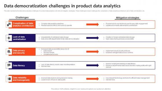 This slide represents the data democratization challenges for product data analytics with relevant mitigation strategies. These challenges include challenges like complication of data analytics architecture, lack of data centralization, etc. Showcasing this set of slides titled Data Democratization Challenges In Product Data Analytics Ideas Pdf. The topics addressed in these templates are Data Privacy And Security, Data Literacy , Data Reliability And Homogeneity. All the content presented in this PPT design is completely editable. Download it and make adjustments in color, background, font etc. as per your unique business setting. This slide represents the data democratization challenges for product data analytics with relevant mitigation strategies. These challenges include challenges like complication of data analytics architecture, lack of data centralization, etc.