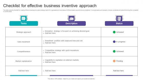This slide presents checklist for creating effective business innovation strategy helpful for organisations to track status of different tasks required to be accomplished. It includes tasks such as aspire, choose, accelerate and extend that should be completed on priority basis. Showcasing this set of slides titled Checklist For Effective Business Inventive Approach Demonstration Pdf. The topics addressed in these templates are Strategic Approach, Competitiveness, Safe Investment. All the content presented in this PPT design is completely editable. Download it and make adjustments in color, background, font etc. as per your unique business setting. This slide presents checklist for creating effective business innovation strategy helpful for organisations to track status of different tasks required to be accomplished. It includes tasks such as aspire, choose, accelerate and extend that should be completed on priority basis.