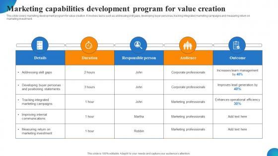 This slide covers marketing development program for value creation. It involves tasks such as addressing skill gaps, developing buyer personas, tracking integrated marketing campaigns and measuring return on marketing investment. Formulating a presentation can take up a lot of effort and time, so the content and message should always be the primary focus. The visuals of the PowerPoint can enhance the presenters message, so our Marketing Capabilities Development Program For Value Creation MDSS For Enhanced Demonstration Pdf was created to help save time. Instead of worrying about the design, the presenter can concentrate on the message while our designers work on creating the ideal templates for whatever situation is needed. Slidegeeks has experts for everything from amazing designs to valuable content, we have put everything into Marketing Capabilities Development Program For Value Creation MDSS For Enhanced Demonstration Pdf This slide covers marketing development program for value creation. It involves tasks such as addressing skill gaps, developing buyer personas, tracking integrated marketing campaigns and measuring return on marketing investment.