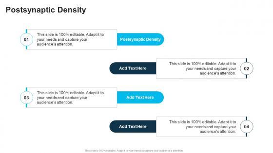 Introducing our well designed Postsynaptic Density In Powerpoint And Google Slides Cpb. This PowerPoint design presents information on topics like Postsynaptic Density. As it is predesigned it helps boost your confidence level. It also makes you a better presenter because of its high-quality content and graphics. This PPT layout can be downloaded and used in different formats like PDF, PNG, and JPG. Not only this, it is available in both Standard Screen and Widescreen aspect ratios for your convenience. Therefore, click on the download button now to persuade and impress your audience. Our Postsynaptic Density In Powerpoint And Google Slides Cpb are topically designed to provide an attractive backdrop to any subject. Use them to look like a presentation pro.