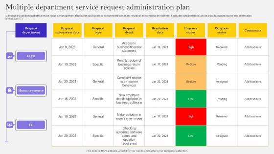 Mentioned slide demonstrates service request management plan by various business departments to monitor helpdesk performance in real time. It includes departments such as legal, human resource and information technology IT. Pitch your topic with ease and precision using this Multiple Department Service Request Administration Plan Ppt Ideas Deck Pdf. This layout presents information on Legal, Human Resource, Information Technology, IT. It is also available for immediate download and adjustment. So, changes can be made in the color, design, graphics or any other component to create a unique layout. Mentioned slide demonstrates service request management plan by various business departments to monitor helpdesk performance in real time. It includes departments such as legal, human resource and information technology IT.