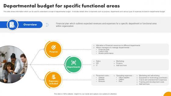 This slide shows information which can be used to understand concept of departmental budget . It includes details other components such as purpose, departments and various types of expenses included in departmental budget. If your project calls for a presentation, then Slidegeeks is your go-to partner because we have professionally designed, easy-to-edit templates that are perfect for any presentation. After downloading, you can easily edit Departmental Budget For Specific Functional Areas Effective And Efficient Tools To Develop Fin SS V and make the changes accordingly. You can rearrange slides or fill them with different images. Check out all the handy templates This slide shows information which can be used to understand concept of departmental budget . It includes details other components such as purpose, departments and various types of expenses included in departmental budget.
