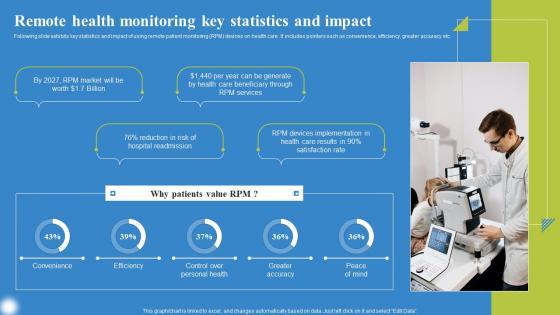 Following slide exhibits key statistics and impact of using remote patient monitoring RPM devices on health care. It includes pointers such as convenience, efficiency, greater accuracy etc. This modern and well arranged Remote Health Monitoring Key Deploying IoT Solutions For Enhanced Healthcare Themes Pdf provides lots of creative possibilities. It is very simple to customize and edit with the Powerpoint Software. Just drag and drop your pictures into the shapes. All facets of this template can be edited with Powerpoint, no extra software is necessary. Add your own material, put your images in the places assigned for them, adjust the colors, and then you can show your slides to the world, with an animated slide included. Following slide exhibits key statistics and impact of using remote patient monitoring RPM devices on health care. It includes pointers such as convenience, efficiency, greater accuracy etc.