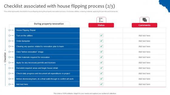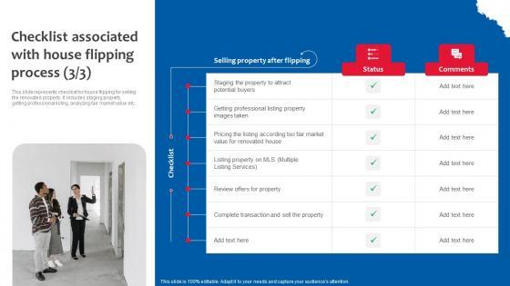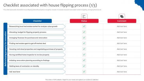 This slide represents checklist for house flipping before the property is bought by investor. It includes research real estate market, budgeting, arranging finances etc. Whether you have daily or monthly meetings, a brilliant presentation is necessary. Checklist Associated House Deploying Effective Property Flipping Strategies Demonstration Pdf can be your best option for delivering a presentation. Represent everything in detail using Checklist Associated House Deploying Effective Property Flipping Strategies Demonstration Pdf and make yourself stand out in meetings. The template is versatile and follows a structure that will cater to your requirements. All the templates prepared by Slidegeeks are easy to download and edit. Our research experts have taken care of the corporate themes as well. So, give it a try and see the results. This slide represents checklist for house flipping before the property is bought by investor. It includes research real estate market, budgeting, arranging finances etc.