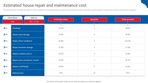 This slide represents estimated expenditure for house maintenance and repairing that gives investor an idea about funds and time required for project completion. It includes client, address, estimate value, quantity etc. Make sure to capture your audiences attention in your business displays with our gratis customizable Estimated House Repair Maintenance Deploying Effective Property Flipping Strategies Summary Pdf. These are great for business strategies, office conferences, capital raising or task suggestions. If you desire to acquire more customers for your tech business and ensure they stay satisfied, create your own sales presentation with these plain slides. This slide represents estimated expenditure for house maintenance and repairing that gives investor an idea about funds and time required for project completion. It includes client, address, estimate value, quantity etc.