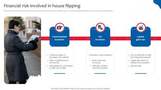 This slide represents major financial risk faced by real estate investor during fix and flip project. It covers unanticipated expenses, tax increase and capital gains tax. Slidegeeks is one of the best resources for PowerPoint templates. You can download easily and regulate Deploying House Flipp for your personal presentations from our wonderful collection. A few clicks is all it takes to discover and get the most relevant and appropriate templates. Use our Templates to add a unique zing and appeal to your presentation and meetings. All the slides are easy to edit and you can use them even for advertisement purposes.
