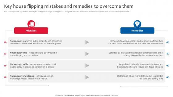 This slide represents key mistake made by house flippers during fix and flip process along with remedies. It covers no or low financial power, time investment, inexperience etc. Are you searching for a Key House Flipping Mistakes Remedies Deploying Effective Property Flipping Strategies Summary Pdf that is uncluttered, straightforward, and original Its easy to edit, and you can change the colors to suit your personal or business branding. For a presentation that expresses how much effort you have put in, this template is ideal With all of its features, including tables, diagrams, statistics, and lists, its perfect for a business plan presentation. Make your ideas more appealing with these professional slides. Download Key House Flipping Mistakes Remedies Deploying Effective Property Flipping Strategies Summary Pdf from Slidegeeks today. This slide represents key mistake made by house flippers during fix and flip process along with remedies. It covers no or low financial power, time investment, inexperience etc.