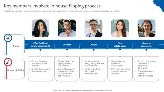 This slide represents team members involved and responsible for flipping process with key roles. It covers CPA, lenders, lawyers, real estate agent and general contractor. Retrieve professionally designed Key Members Involved In House Deploying Effective Property Flipping Strategies Structure Pdf to effectively convey your message and captivate your listeners. Save time by selecting pre made slideshows that are appropriate for various topics, from business to educational purposes. These themes come in many different styles, from creative to corporate, and all of them are easily adjustable and can be edited quickly. Access them as PowerPoint templates or as Google Slides themes. You do not have to go on a hunt for the perfect presentation because Slidegeeks got you covered from everywhere. This slide represents team members involved and responsible for flipping process with key roles. It covers CPA, lenders, lawyers, real estate agent and general contractor.