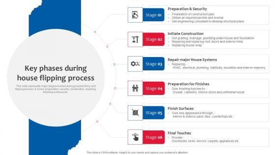 This slide represents major stages involved during property fixing and flipping process. It covers preparation, security, construction, repairing, finishing surfaces etc. Slidegeeks has constructed Key Phases During House Flipping Deploying Effective Property Flipping Strategies Summary Pdf after conducting extensive research and examination. These presentation templates are constantly being generated and modified based on user preferences and critiques from editors. Here, you will find the most attractive templates for a range of purposes while taking into account ratings and remarks from users regarding the content. This is an excellent jumping off point to explore our content and will give new users an insight into our top notch PowerPoint Templates. This slide represents major stages involved during property fixing and flipping process. It covers preparation, security, construction, repairing, finishing surfaces etc.