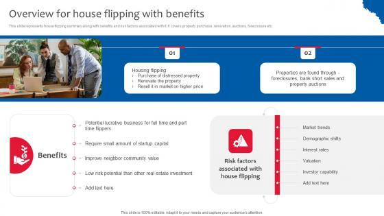 This slide represents house flipping summary along with benefits and risk factors associated with it. It covers property purchase, renovation, auctions, foreclosure etc. From laying roadmaps to briefing everything in detail, our templates are perfect for you. You can set the stage with your presentation slides. All you have to do is download these easy to edit and customizable templates. Overview For House Flipping Deploying Effective Property Flipping Strategies Demonstration Pdf will help you deliver an outstanding performance that everyone would remember and praise you for. Do download this presentation today. This slide represents house flipping summary along with benefits and risk factors associated with it. It covers property purchase, renovation, auctions, foreclosure etc.