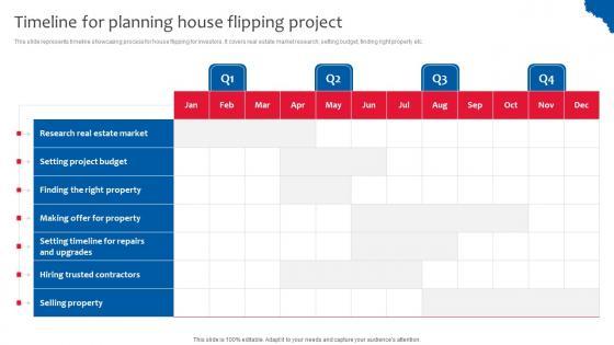 This slide represents timeline showcasing process for house flipping for investors. It covers real estate market research, setting budget, finding right property etc. If your project calls for a presentation, then Slidegeeks is your go to partner because we have professionally designed, easy to edit templates that are perfect for any presentation. After downloading, you can easily edit Timeline For Planning House Deploying Effective Property Flipping Strategies Icons Pdf and make the changes accordingly. You can rearrange slides or fill them with different images. Check out all the handy templates This slide represents timeline showcasing process for house flipping for investors. It covers real estate market research, setting budget, finding right property etc.