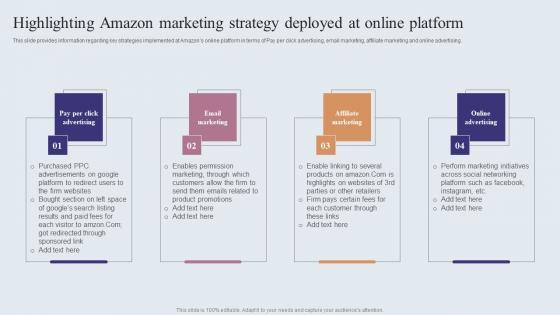 This slide provides information regarding key strategies implemented at Amazons online platform in terms of Pay per click advertising, email marketing, affiliate marketing and online advertising. This Highlighting Amazon Marketing Strategy Deployed At Online Platform Portrait PDF is perfect for any presentation, be it in front of clients or colleagues. It is a versatile and stylish solution for organizing your meetings. The Highlighting Amazon Marketing Strategy Deployed At Online Platform Portrait PDF features a modern design for your presentation meetings. The adjustable and customizable slides provide unlimited possibilities for acing up your presentation. Slidegeeks has done all the homework before launching the product for you. So, do not wait, grab the presentation templates today.