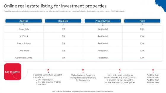 This slide represents online listing of properties that work as one of the source for investors to find properties for flipping. It covers property address, prices, FSBO, auctions etc. From laying roadmaps to briefing everything in detail, our templates are perfect for you. You can set the stage with your presentation slides. All you have to do is download these easy to edit and customizable templates. Deploying House Flipping Business Plan Online Real Estate Listing For Investment Properties Demonstration PDF will help you deliver an outstanding performance that everyone would remember and praise you for. Do download this presentation today.