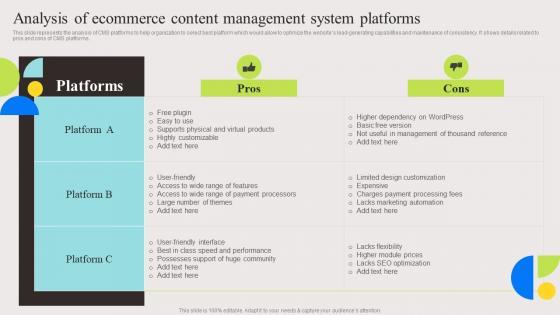 This slide represents the analysis of CMS platforms to help organization to select best platform which would allow to optimize the websites lead generating capabilities and maintenance of consistency. It shows details related to pros and cons of CMS platforms. Create an editable Analysis Of Ecommerce Content Evaluation And Deployment Of Enhanced Graphics Pdf that communicates your idea and engages your audience. Whether you are presenting a business or an educational presentation, pre designed presentation templates help save time. Analysis Of Ecommerce Content Evaluation And Deployment Of Enhanced Graphics Pdf is highly customizable and very easy to edit, covering many different styles from creative to business presentations. Slidegeeks has creative team members who have crafted amazing templates. So, go and get them without any delay. This slide represents the analysis of CMS platforms to help organization to select best platform which would allow to optimize the websites lead generating capabilities and maintenance of consistency. It shows details related to pros and cons of CMS platforms.
