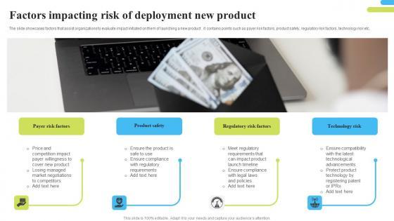 The slide showcases factors that assist organizations to evaluate impact initiated on them of launching a new product . it contains points such as payer risk factors, product safety, regulatory risk factors, technology risk etc. Pitch your topic with ease and precision using this Factors Impacting Risk Of Deployment New Product Themes Pdf. This layout presents information on Payer Risk Factors, Product Safety, Regulatory Risk Factors, Technology Risk. It is also available for immediate download and adjustment. So, changes can be made in the color, design, graphics or any other component to create a unique layout. The slide showcases factors that assist organizations to evaluate impact initiated on them of launching a new product . it contains points such as payer risk factors, product safety, regulatory risk factors, technology risk etc.