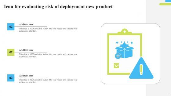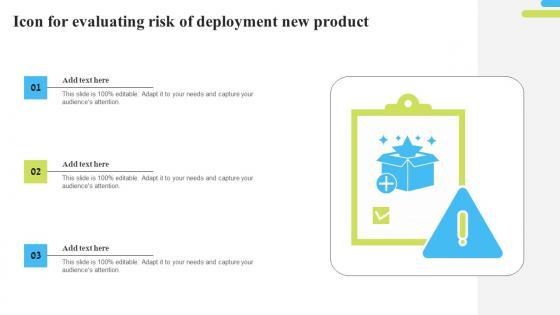 Showcasing this set of slides titled Icon For Evaluating Risk Of Deployment New Product Demonstration Pdf. The topics addressed in these templates are Icon For Evaluating Risk, Deployment New Product. All the content presented in this PPT design is completely editable. Download it and make adjustments in color, background, font etc. as per your unique business setting. Our Icon For Evaluating Risk Of Deployment New Product Demonstration Pdf are topically designed to provide an attractive backdrop to any subject. Use them to look like a presentation pro.