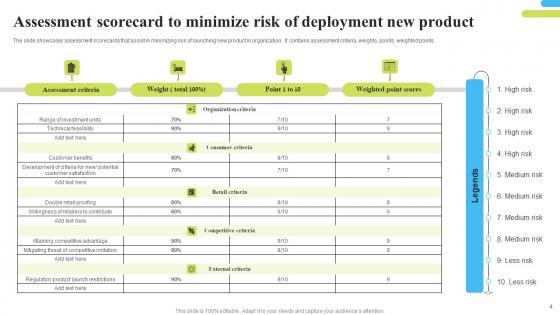 The slide showcases assessment scorecards that assist in minimizing risk of launching new product in organization . It contains assessment criteria, weights, points, weighted points. Showcasing this set of slides titled Assessment Scorecard To Minimize Risk Of Deployment New Product Topics Pdf. The topics addressed in these templates are Assessment Scorecards, Minimizing Risk, Launching New Product. All the content presented in this PPT design is completely editable. Download it and make adjustments in color, background, font etc. as per your unique business setting. The slide showcases assessment scorecards that assist in minimizing risk of launching new product in organization . It contains assessment criteria, weights, points, weighted points.