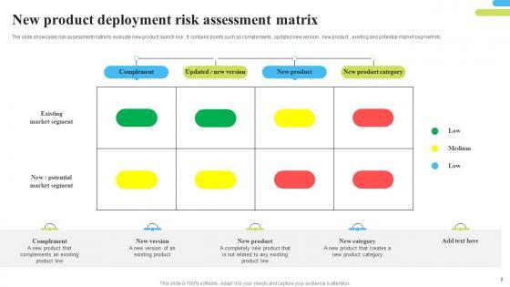 The slide showcases risk assessment matrix to evaluate new product launch risk. It contains points such as complements, updated new version, new product, existing and potential market segment etc. Pitch your topic with ease and precision using this New Product Deployment Risk Assessment Matrix Structure Pdf. This layout presents information on New Product Deployment, Risk Assessment Matrix, Potential Market Segment. It is also available for immediate download and adjustment. So, changes can be made in the color, design, graphics or any other component to create a unique layout. The slide showcases risk assessment matrix to evaluate new product launch risk. It contains points such as complements, updated new version, new product, existing and potential market segment etc.