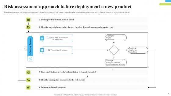 The slide showcases risk assessment approach followed by organizations to create a mitigation plan for eliminating risk on new product launch through an organization in market. Showcasing this set of slides titled Risk Assessment Approach Before Deployment A New Product Slides Pdf. The topics addressed in these templates are Risk Assessment Approach, Deployment A New Product, Eliminating Risk. All the content presented in this PPT design is completely editable. Download it and make adjustments in color, background, font etc. as per your unique business setting. The slide showcases risk assessment approach followed by organizations to create a mitigation plan for eliminating risk on new product launch through an organization in market.