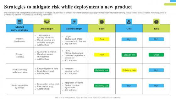 The slide represents strategies that assist organization to mitigate prevalent risks. It contains market entry strategies such as product development, product licensing, product existing and cooperation, market acquisition by product along with time consumed, cost per strategy, risk involved. Pitch your topic with ease and precision using this Strategies To Mitigate Risk While Deployment A New Product Template Pdf. This layout presents information on Strategies To Mitigate Risk, Deployment A New Product, Market Acquisition. It is also available for immediate download and adjustment. So, changes can be made in the color, design, graphics or any other component to create a unique layout. The slide represents strategies that assist organization to mitigate prevalent risks. It contains market entry strategies such as product development, product licensing, product existing and cooperation, market acquisition by product along with time consumed, cost per strategy, risk involved.