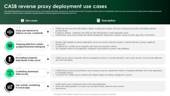 This slide illustrates the use cases of reverse proxy server deployment of the cloud access security broker model. The purpose of this slide is to highlight the main use cases of reverse proxy deployment, including using user behavior to enforce access constraints, keeping data from certain programs from being lost, and so on. If you are looking for a format to display your unique thoughts, then the professionally designed CASB 2 0 IT CASB Reverse Proxy Deployment Use Cases is the one for you. You can use it as a Google Slides template or a PowerPoint template. Incorporate impressive visuals, symbols, images, and other charts. Modify or reorganize the text boxes as you desire. Experiment with shade schemes and font pairings. Alter, share or cooperate with other people on your work. Download CASB 2 0 IT CASB Reverse Proxy Deployment Use Cases and find out how to give a successful presentation. Present a perfect display to your team and make your presentation unforgettable. This slide illustrates the use cases of reverse proxy server deployment of the cloud access security broker model. The purpose of this slide is to highlight the main use cases of reverse proxy deployment, including using user behavior to enforce access constraints, keeping data from certain programs from being lost, and so on.