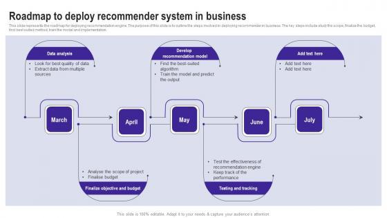 This slide represents the roadmap for deploying recommendation engine. The purpose of this slide is to outline the steps involved in deploying recommender in business. The key steps include study the scope, finalize the budget, find best suited method, train the model and implementation. Slidegeeks is here to make your presentations a breeze with Roadmap To Deploy Recommender System In Business Use Cases Of Filtering Methods Download Pdf With our easy to use and customizable templates, you can focus on delivering your ideas rather than worrying about formatting. With a variety of designs to choose from, you are sure to find one that suits your needs. And with animations and unique photos, illustrations, and fonts, you can make your presentation pop. So whether you are giving a sales pitch or presenting to the board, make sure to check out Slidegeeks first This slide represents the roadmap for deploying recommendation engine. The purpose of this slide is to outline the steps involved in deploying recommender in business. The key steps include study the scope, finalize the budget, find best suited method, train the model and implementation.