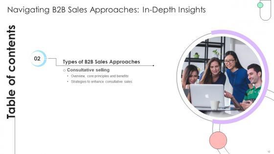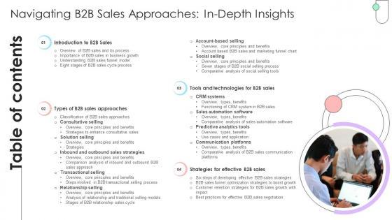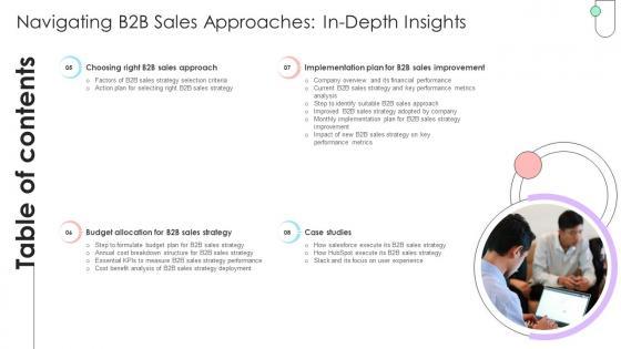 Coming up with a presentation necessitates that the majority of the effort goes into the content and the message you intend to convey. The visuals of a PowerPoint presentation can only be effective if it supplements and supports the story that is being told. Keeping this in mind our experts created Table Of Contents For Navigating B2B Sales Approaches In Depth Insights SA SS V to reduce the time that goes into designing the presentation. This way, you can concentrate on the message while our designers take care of providing you with the right template for the situation. Our Table Of Contents For Navigating B2B Sales Approaches In Depth Insights SA SS V are topically designed to provide an attractive backdrop to any subject. Use them to look like a presentation pro.