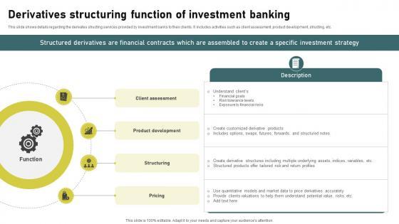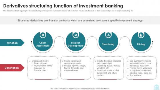 This slide shows details regarding the derivates structing services provided by investment banks to their clients. It includes activities such as client assessment, product development, structing, etc. Are you in need of a template that can accommodate all of your creative concepts This one is crafted professionally and can be altered to fit any style. Use it with Google Slides or PowerPoint. Include striking photographs, symbols, depictions, and other visuals. Fill, move around, or remove text boxes as desired. Test out color palettes and font mixtures. Edit and save your work, or work with colleagues. Download Derivatives Structuring Function Of Investment Understanding Investment Banking Framework Fin SS V and observe how to make your presentation outstanding. Give an impeccable presentation to your group and make your presentation unforgettable. This slide shows details regarding the derivates structing services provided by investment banks to their clients. It includes activities such as client assessment, product development, structing, etc.
