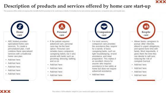 The purpose of this slide is to express the benefits the firm provides to its customers or clients. It includes home care services, personal care, companion care, and respite care. Are you in need of a template that can accommodate all of your creative concepts This one is crafted professionally and can be altered to fit any style. Use it with Google Slides or PowerPoint. Include striking photographs, symbols, depictions, and other visuals. Fill, move around, or remove text boxes as desired. Test out color palettes and font mixtures. Edit and save your work, or work with colleagues. Download Company Analysis Of The Home Care Start Up Description Of Products And Services Offered Sample PDF and observe how to make your presentation outstanding. Give an impeccable presentation to your group and make your presentation unforgettable.