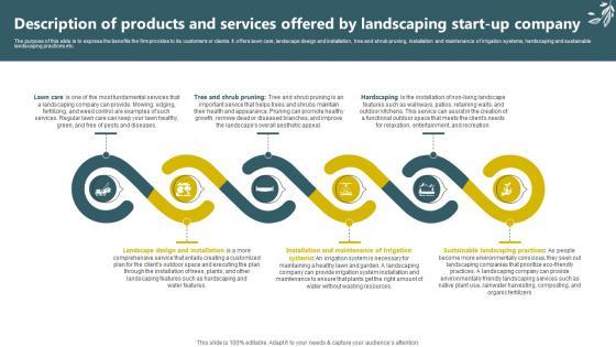 The purpose of this slide is to express the benefits the firm provides to its customers or clients. It offers lawn care, landscape design and installation, tree and shrub pruning, installation and maintenance of irrigation systems, hardscaping and sustainable landscaping practices etc. Get a simple yet stunning designed Description Of Products And Services Offered By Landscaping Start Lawn Care BP SS V. It is the best one to establish the tone in your meetings. It is an excellent way to make your presentations highly effective. So, download this PPT today from Slidegeeks and see the positive impacts. Our easy-to-edit Description Of Products And Services Offered By Landscaping Start Lawn Care BP SS V can be your go-to option for all upcoming conferences and meetings. So, what are you waiting for Grab this template today. The purpose of this slide is to express the benefits the firm provides to its customers or clients. It offers lawn care, landscape design and installation, tree and shrub pruning, installation and maintenance of irrigation systems, hardscaping and sustainable landscaping practices etc.