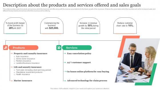 This slide provides a gist of products and services which the business will offer along with the revenue assumptions for the future growth of the business. What are the parameters which the business will set for increased sales and different food products and services which the business will be offering. From laying roadmaps to briefing everything in detail, our templates are perfect for you. You can set the stage with your presentation slides. All you have to do is download these easy-to-edit and customizable templates. Description About The Products And Services Offered And Sales Goals Assurant Insurance Agency Brochure Pdf will help you deliver an outstanding performance that everyone would remember and praise you for. Do download this presentation today. This slide provides a gist of products and services which the business will offer along with the revenue assumptions for the future growth of the business. What are the parameters which the business will set for increased sales and different food products and services which the business will be offering.