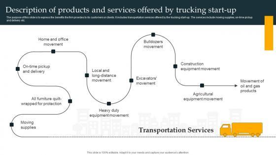 The purpose of this slide is to express the benefits the firm provides to its customers or clients. It includes transportation services offered by the trucking start up. The services include moving supplies, on time pickup and delivery etc.Get a simple yet stunning designed Description Of Products And Services Offered Freight Trucking Business Plan Pictures Pdf It is the best one to establish the tone in your meetings. It is an excellent way to make your presentations highly effective. So, download this PPT today from Slidegeeks and see the positive impacts. Our easy-to-edit Description Of Products And Services Offered Freight Trucking Business Plan Pictures Pdf can be your go-to option for all upcoming conferences and meetings. So, what are you waiting for Grab this template today. The purpose of this slide is to express the benefits the firm provides to its customers or clients. It includes transportation services offered by the trucking start up. The services include moving supplies, on time pickup and delivery etc.